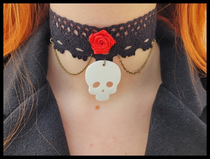 żywicy czaszka .Na tasiemce czerwony kwiat.