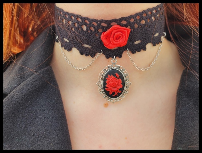 z żywicy-róża.Na tasiemce mały czerwony kwiat.