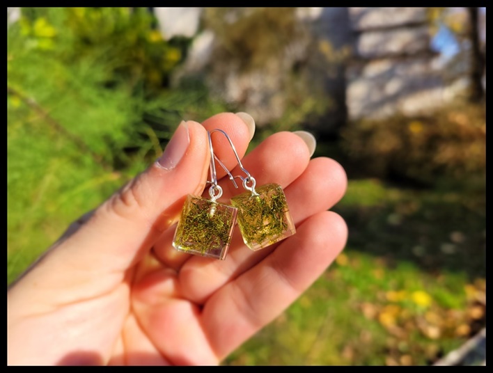 kawałkami mchu. Kolczyki w kształcie kostki ,