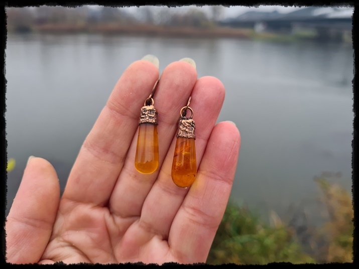 Kolczyki miedziane z bursztynem