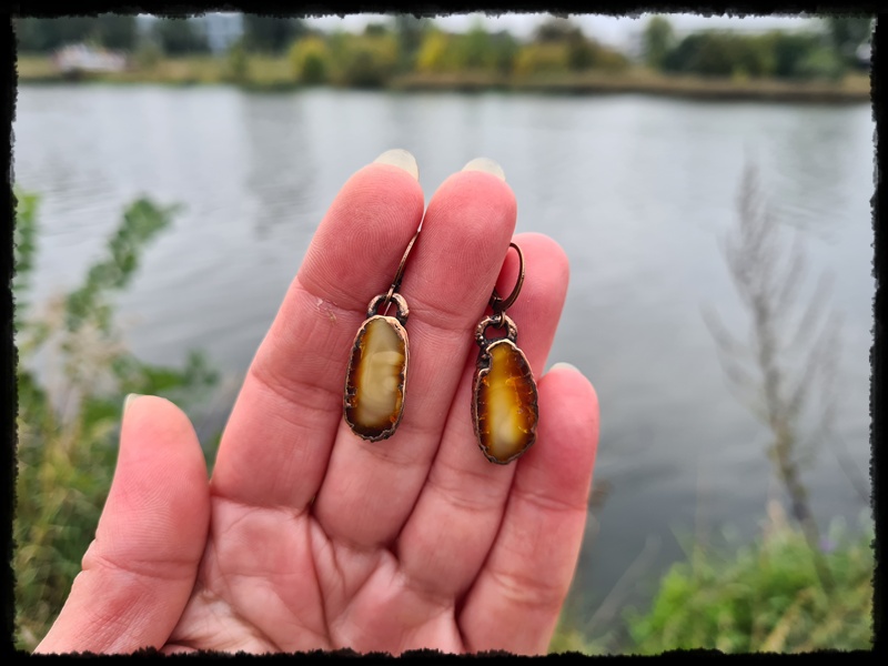Kolczyki miedziane z bursztynem