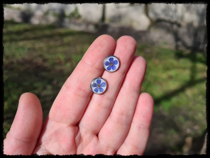 z zatopionymi w żywicy kwiatami niezapominajki.