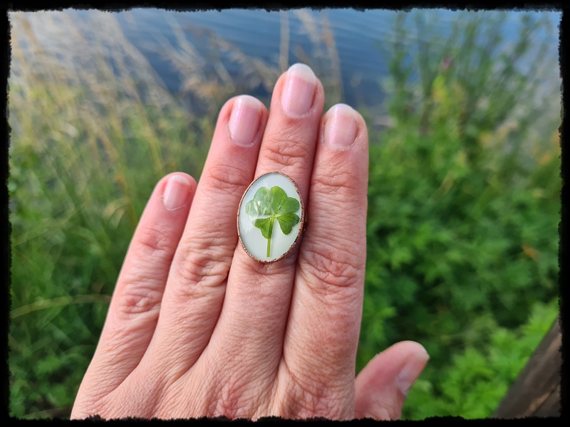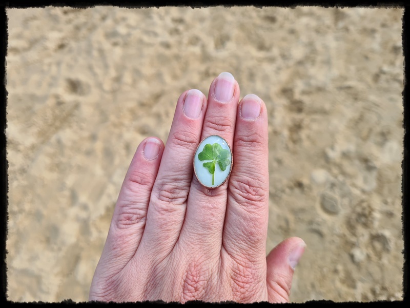 Pierścionek ręcznie wykonany z żywicy z zatopioną czterolisną