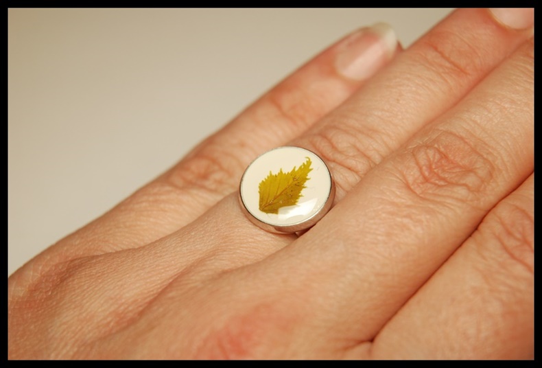 w żywicy listkiem brzozy. Każdy pierścionek jest