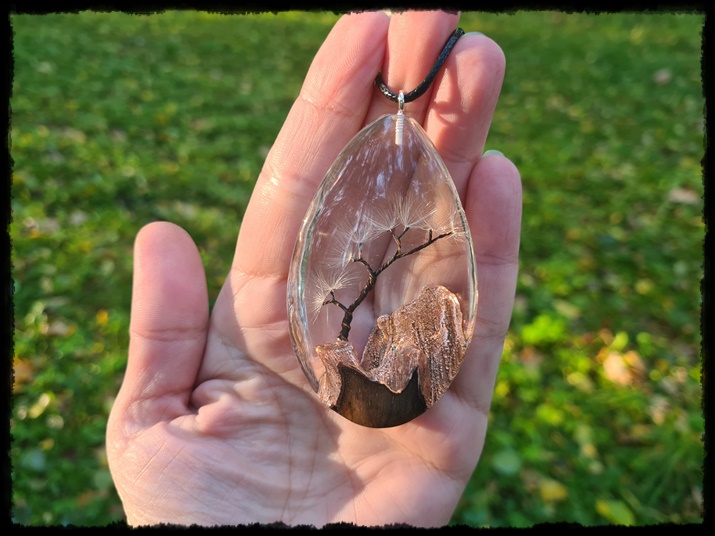 Wisior ręcznie wykonany z połączenia drzewa i żywicy.