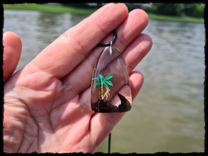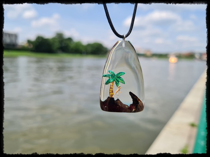 Wisior ręcznie wykonany z połączenia drewna i żywicy.