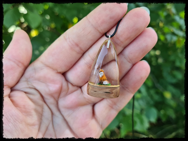 Wisior ręcznie wykonany z połączenia drzewa i żywicy.