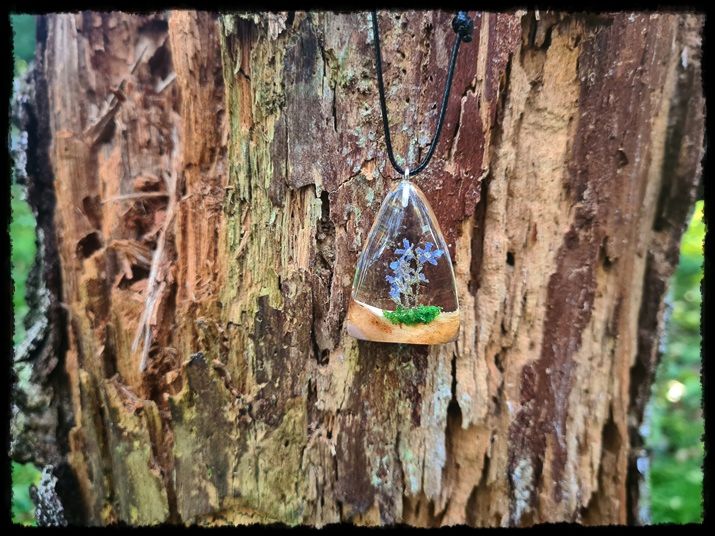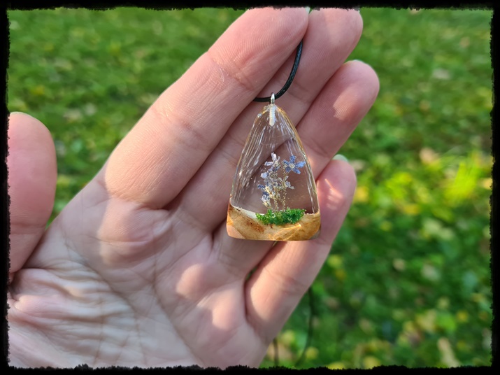 Wisior ręcznie wykonany z połączenia drzewa i żywicy.