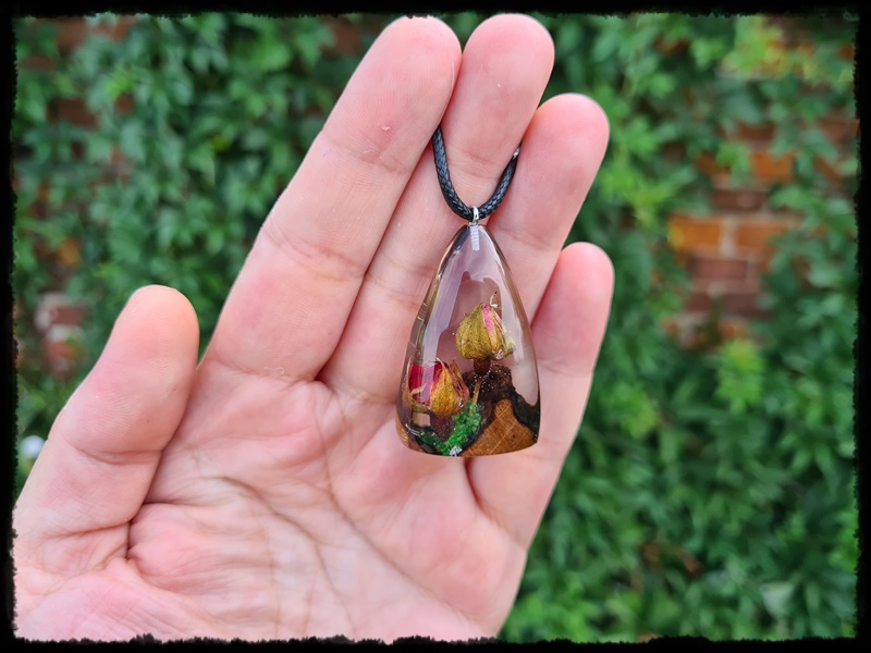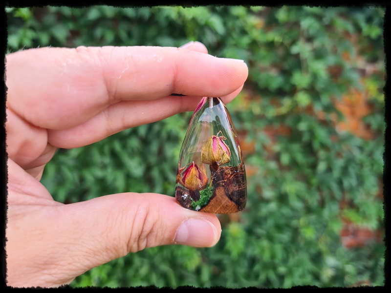Wisior ręcznie wykonany z połączenia drzewa i żywicy.