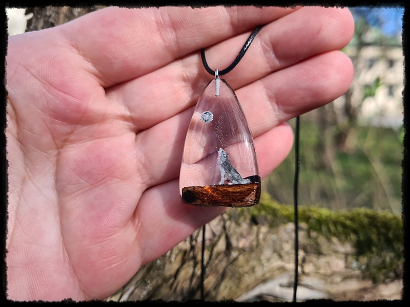 Wisior ręcznie wykonany z połączenia drzewa i żywicy.