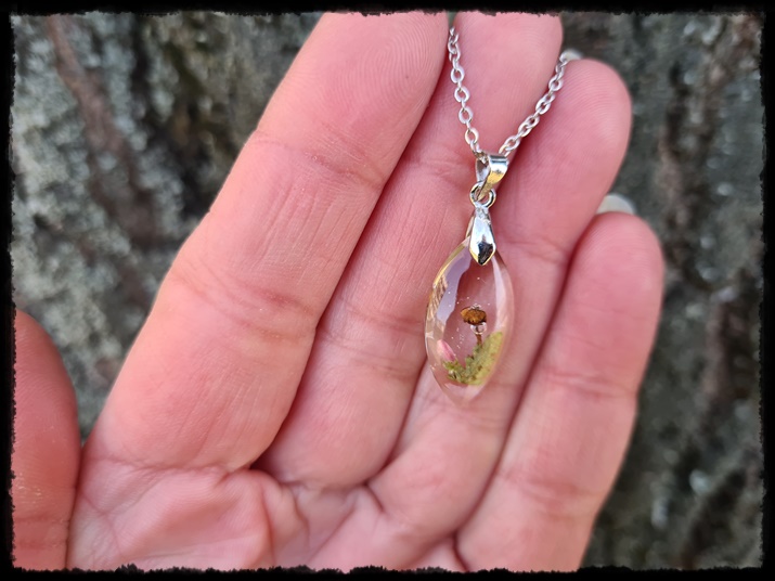 Wisior ręcznie wykonany z żywicy z zatopionym grzybem.