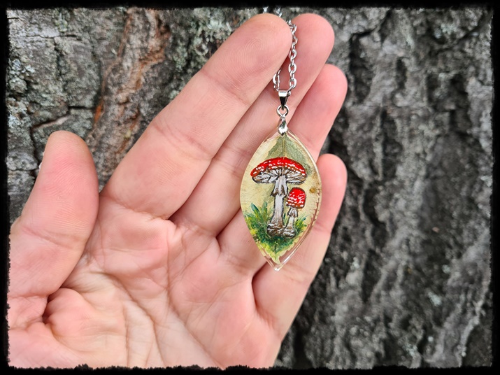 z ręcznie malowanymi grzybami . Wisior wyszlifowany na