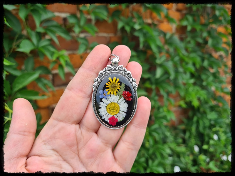 srebrnym, z zatopionymi w żywicy różnymi kwiatami.