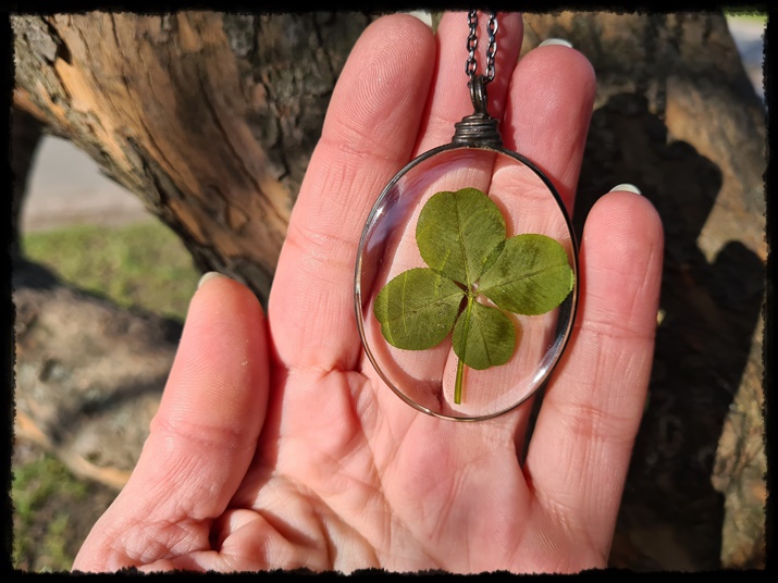 Wisior ręcznie wykonany z żywicy, z zatopioną czterolistną