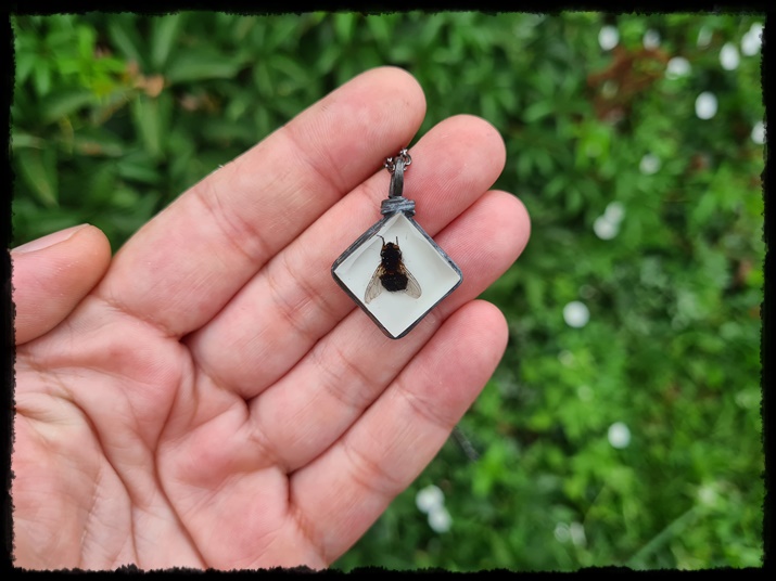 Wisior ręcznie wykonany z żywicy z zatopioną muchą.