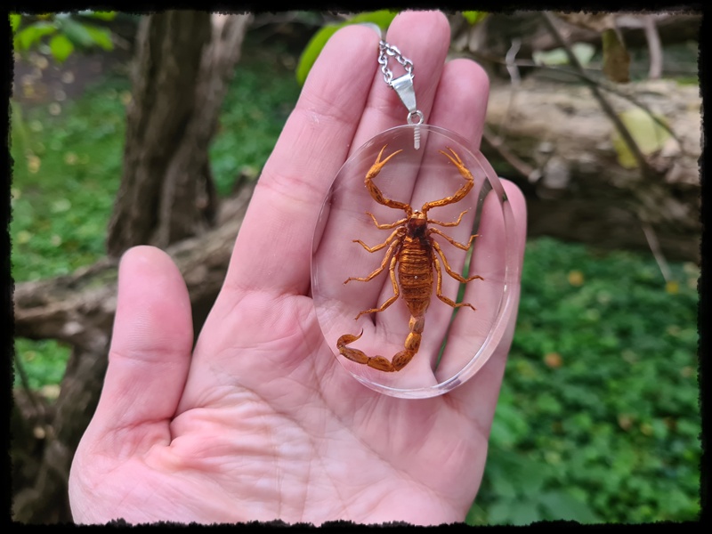 Wisior ręcznie wykonany z żywicy z zatopionym skorpionem.